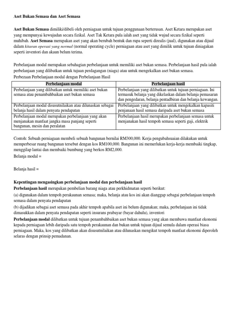 . Aset Bukan Semasa Aset Tetap Digunakan untuk menjalankan perniagaan dan bukan untuk tujuan jualan semula. Terbahagi kepada dua iaitu. Aset semasa ditakrifkan sebagai item yang dipegang untuk.
